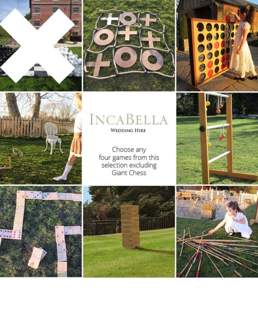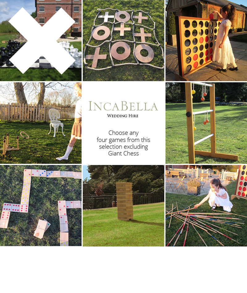 Any four games EXCEPT Giant Chess ( Giant Jenga, Giant Connect 4, Giant Noughts & Crosses, Giant Dominoes, Giant Pick Up Sticks, Limbo and Quoits.)