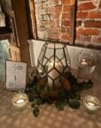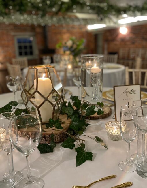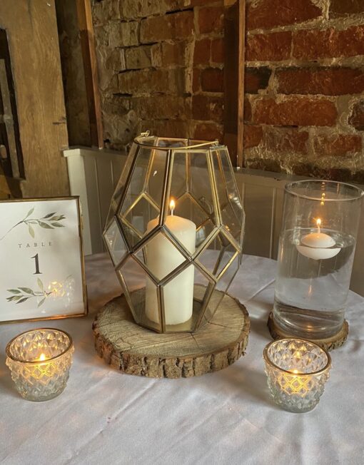 Each table centre piece includes an antique brass Mohani lantern with candle set on a rustic wood slice surrounded by fresh greenery, along with 5 diamond glass t-lights as well as a pretty table number holder and card.