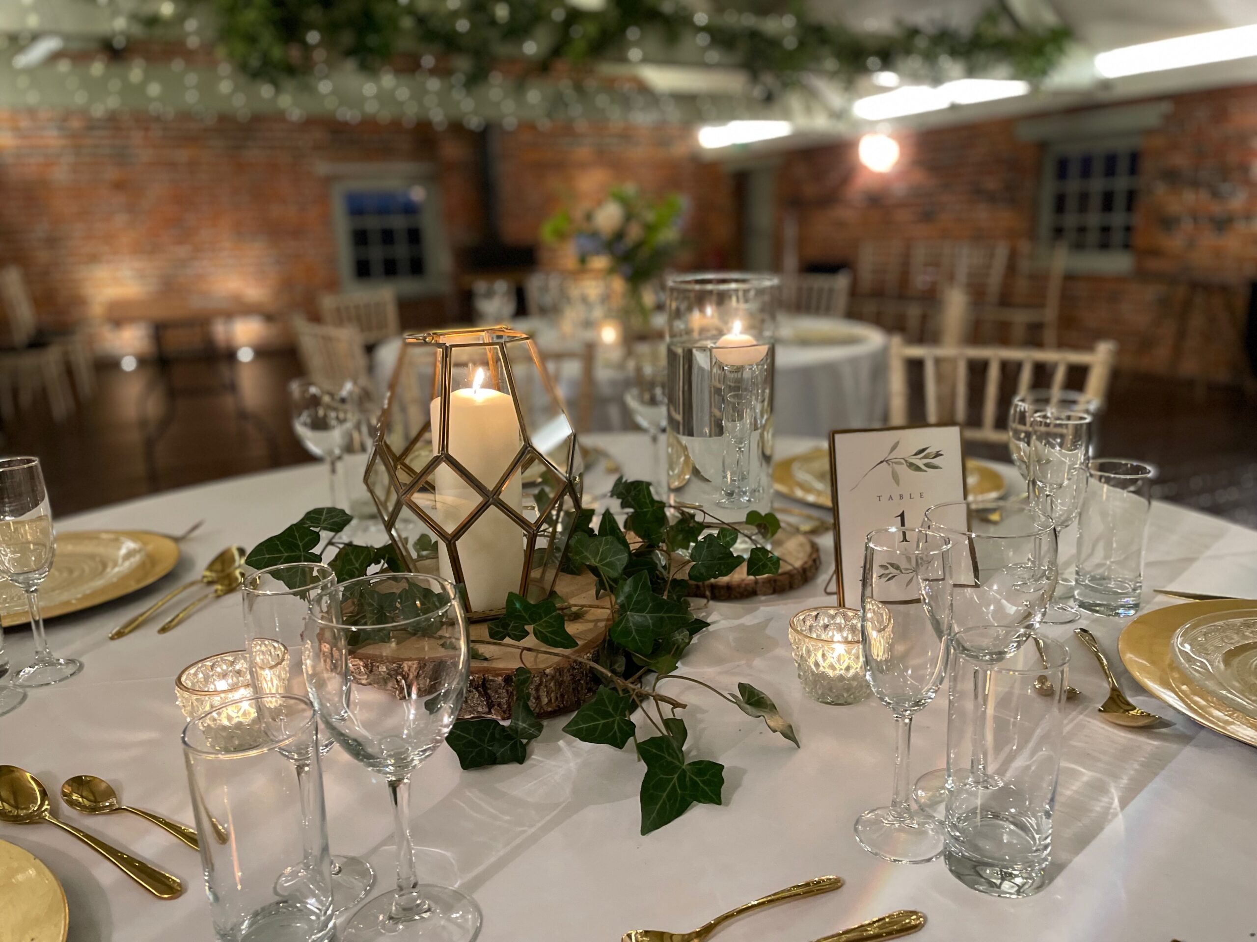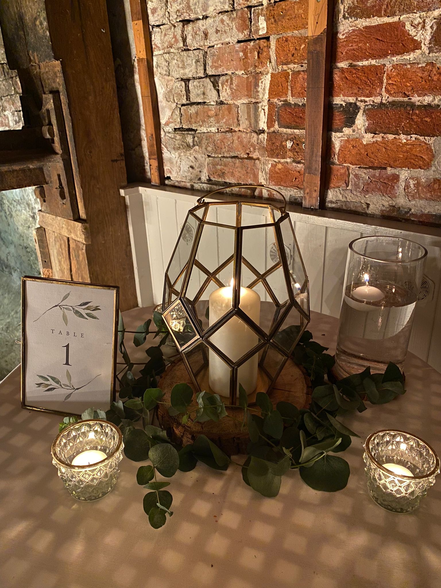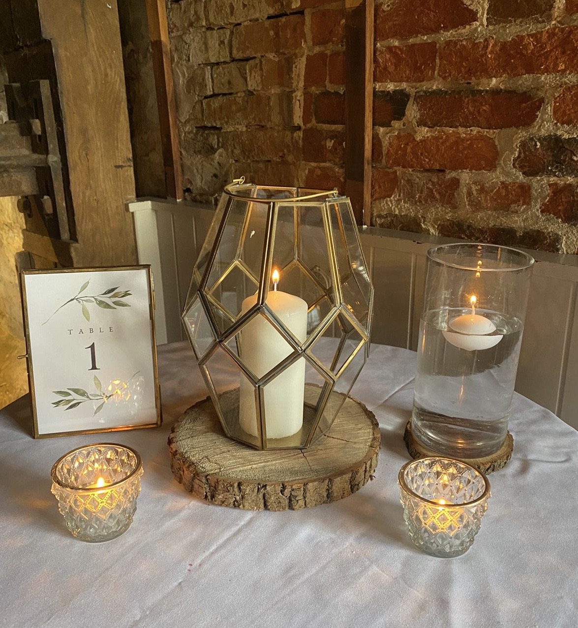 Each table centre piece includes an antique brass Mohani lantern with candle set on a rustic wood slice surrounded by fresh greenery, along with 5 diamond glass t-lights as well as a pretty table number holder and card.